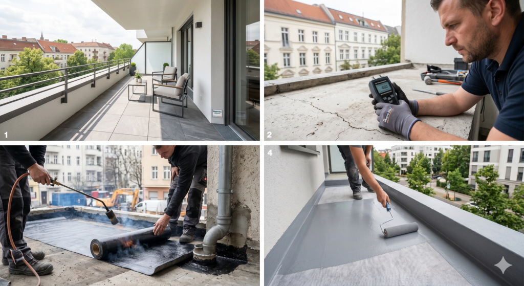 Wir führen umfassende Balkonsanierungen durch – von der Instandsetzung der Konstruktion über die professionelle Balkonabdichtung bis hin zum neuen Oberbelag. Wir stellen Sicherheit und Ästhetik wieder her.